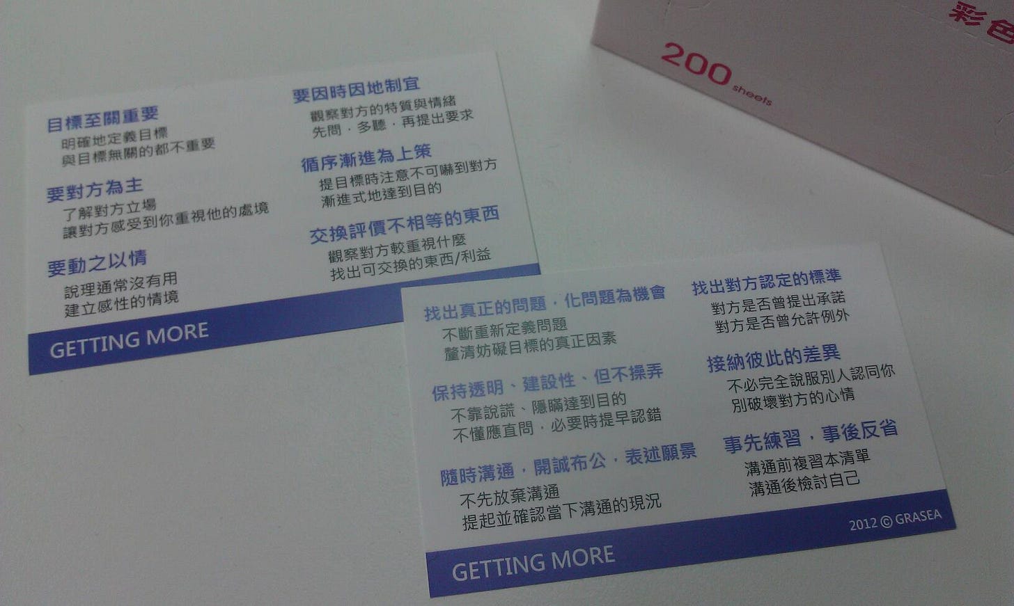 最有趣的是不只是討論書本身,還會有很多延伸的做法,例如Rovers實在太愛「沃頓商學院最受歡迎的談判課」這本書,在當次讀書會後,將大家有結論的談判技巧做成名片大小的談判小卡,再送印發回來給大家,那是我超愛還拿了十幾張,不過很丟臉的是我從來沒用過。