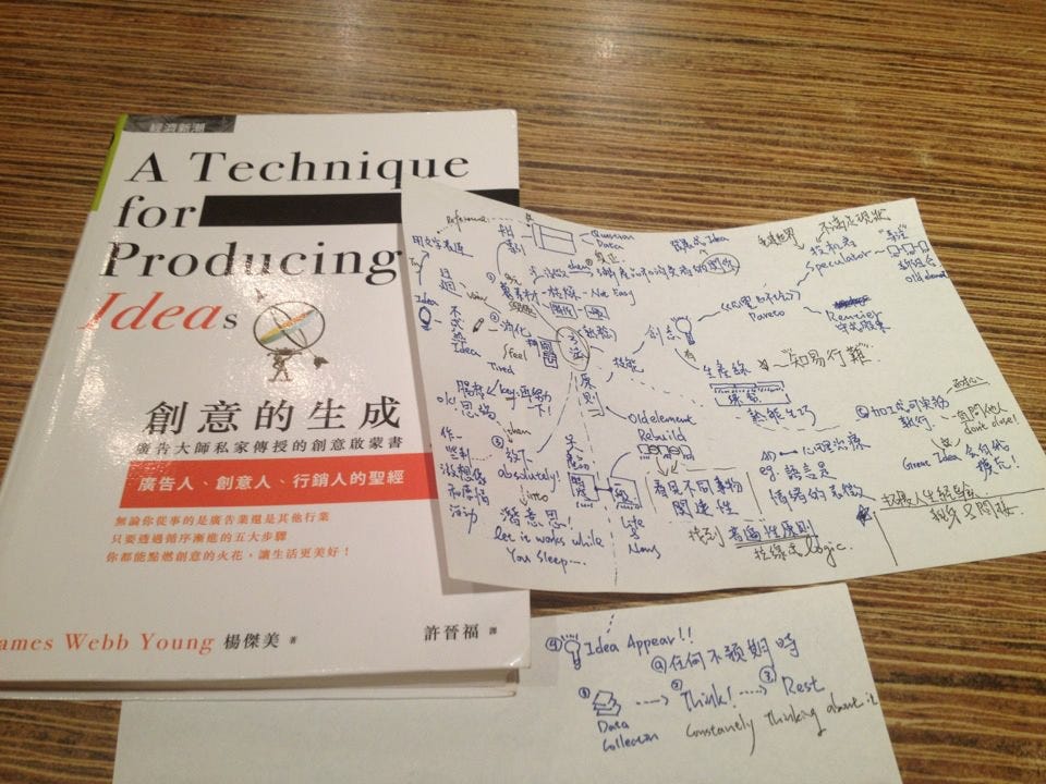 突然有一個點子從腦中靈光一閃跑出來,我從年輕的時候就在想這到底是怎麼跑出來的。大概在30歲的時候就看到一本書《創意的生成(A Technique for Producing Ideas)》,James Webb Young這位廣告學大師用53頁講出了一個人怎麼生成創意: