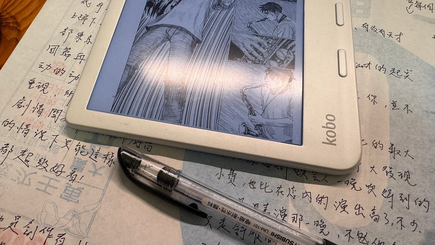 為了度過這段時間我的替代品就是看漫畫,將《BlueGiant藍色巨星》描寫次中音薩克斯風樂手宮本大的故事再看一次,而且多年沒看劇情已經從歐洲推進到了紐約。因為不用社群媒體很多時間也因此釋放出來,在陪小孩寫寒假作業的時候,就寫了對《BlueGiant藍色巨星》為什麼可以那麼好看。
