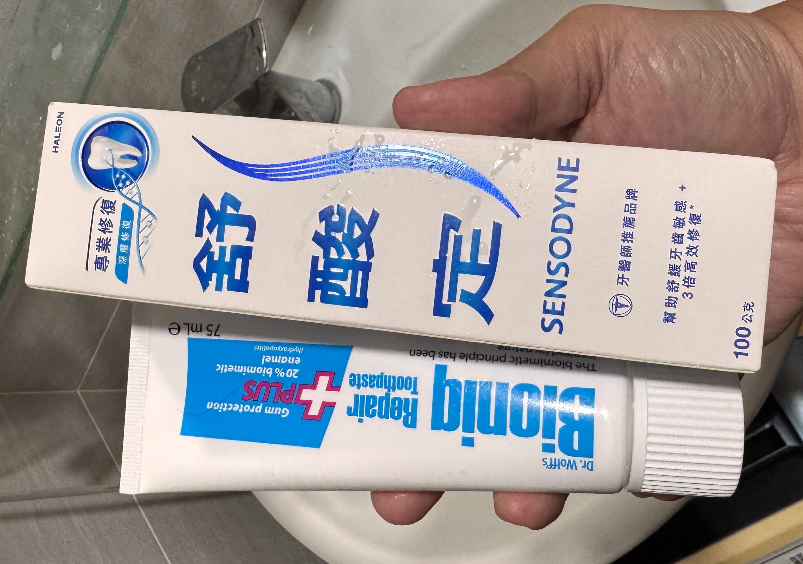 ▲另外大量喝氣泡水可能會造成牙齒琺瑯質慢性磨損,所以買了Bioniq 貝歐尼修復牙膏和舒酸定進階強化琺瑯質牙膏來來堅固修復和抗酸蝕。