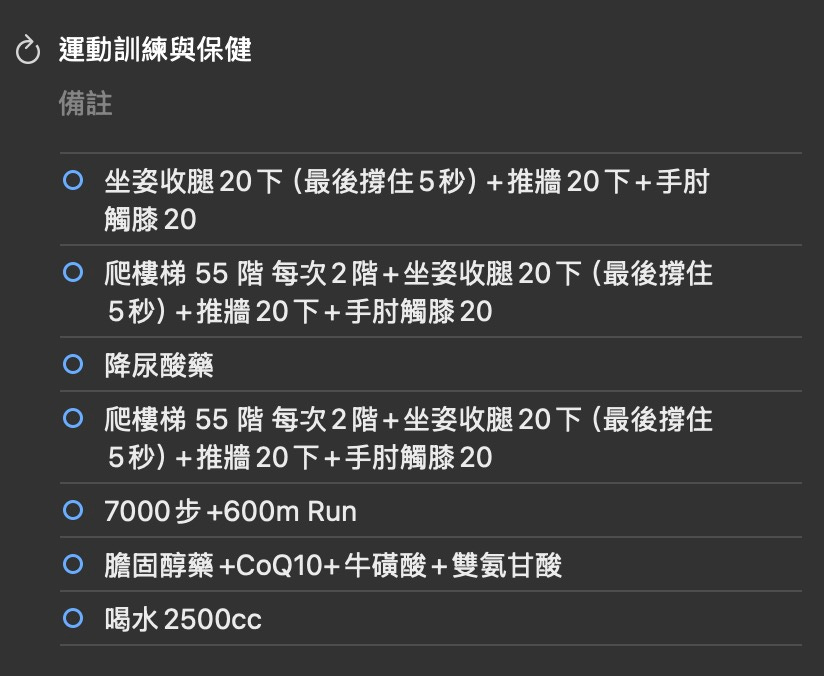 因為我終於願意把這個提案放入Things待辦事項App,而且是循環執行。因為在GTD的精神中要把一件事出現在「今日」是絕對必須要的做、而且最重要的事情才能。這次我願意放入關鍵是以前只知道「What」要做什麼事(吃藥、喝水、健康飲食、睡覺),但這次我了解了「Why和How」,知道了為什麼要這麼作以及執行策略,那我就很願意去執行了。