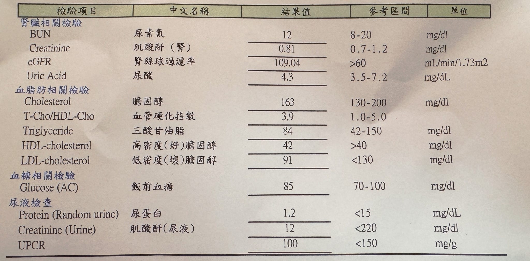 最近回診所拿抽血驗尿報告,結果所有數值都非常好,上一次測還有紅字,連護士們都在為我歡呼,醫生也幫我減藥並說下次半年後再來抽血就可。