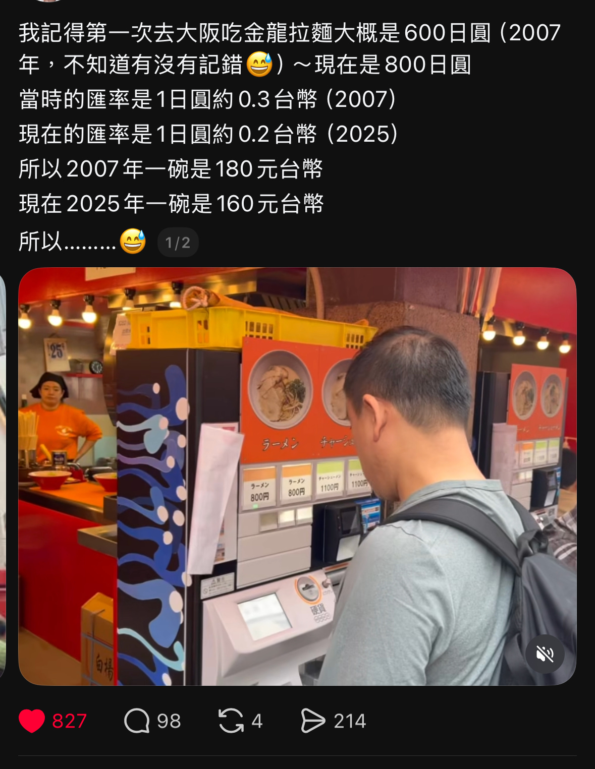 大家近年很喜歡去日本,除了好玩以外就是日本產品的物價和服務相對於台幣更便宜。看下圖一位脆友的分享,2007年一碗大阪拉麵台幣為180元、18年後這碗拉麵反而倒掛到160元,重點是這個160元對到2007年的購買力只剩下126元,所以還便宜了54元,這樣的日本拉麵不吃爆嗎?